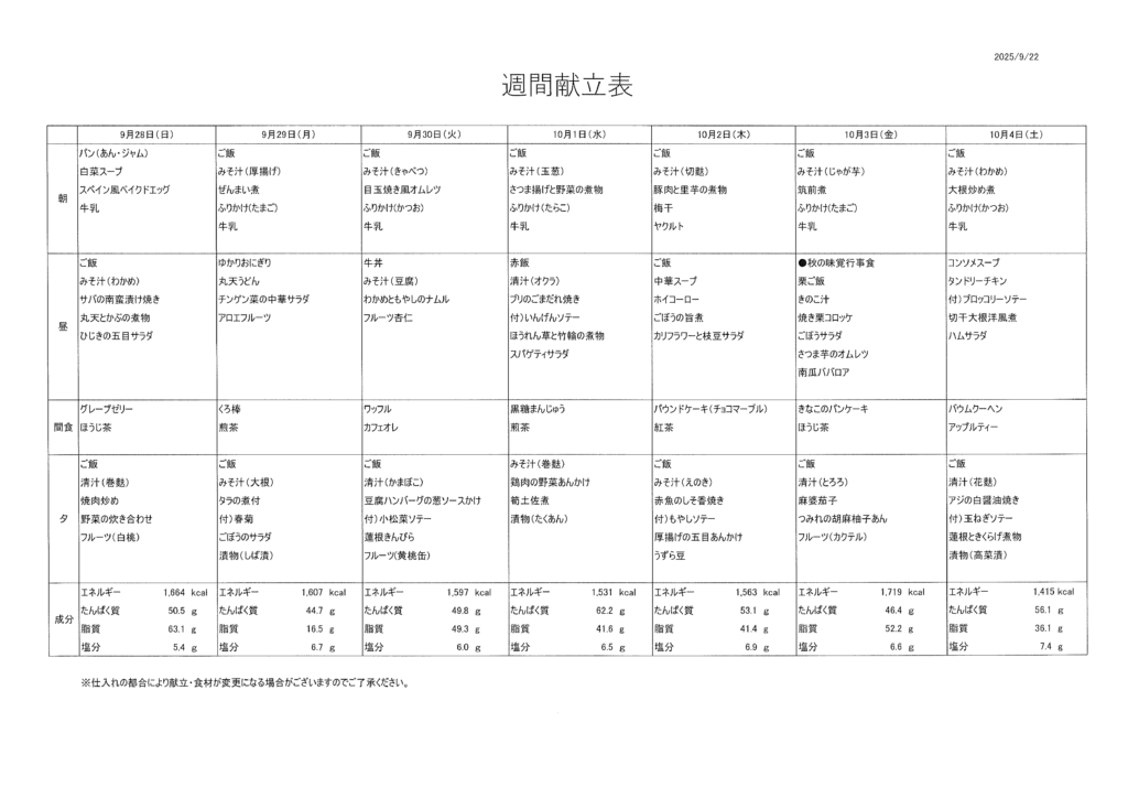 献立表9/28~10/4 silstaff0928 2025年9月21日 2025年9月21日 お知らせ / その他(デイサービス) / その他(有料老人ホーム) / デイサービス / ホーム 前の投稿敬老会 次の投稿お楽しみ❢おやつ🍧(デイサービス)