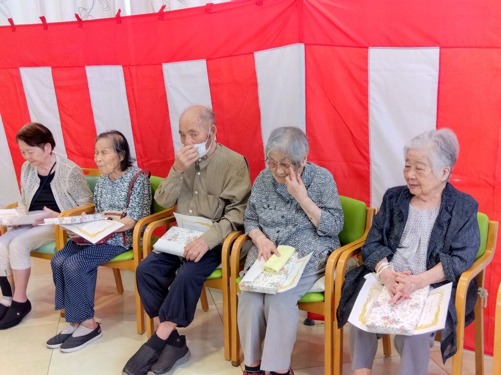 今年お祝いして頂いたご利用者様は、100歳(百寿)2名 、99歳(百寿)1名 90歳(卒寿)2名 88歳(米寿)5名 80歳(傘寿)3名でした✨いつも元気でおられる皆さんには頭が上がりません!表彰式が始まり、感極まって涙ぐまれる方もいらっしゃいました(´;ω;`)ウッ…「こんなに長く、元気でいれるなんて思ってなかった。」「また明日から頑張れます。」と心を新たに決意される姿がとても心に沁みました!