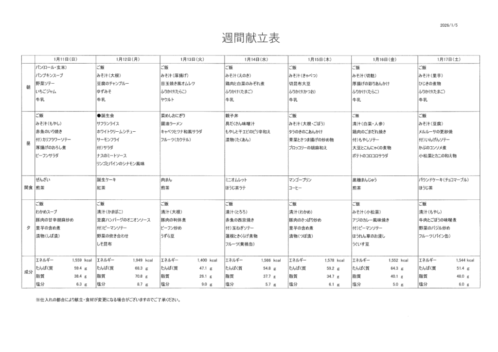 献立表(1/11~1/17)