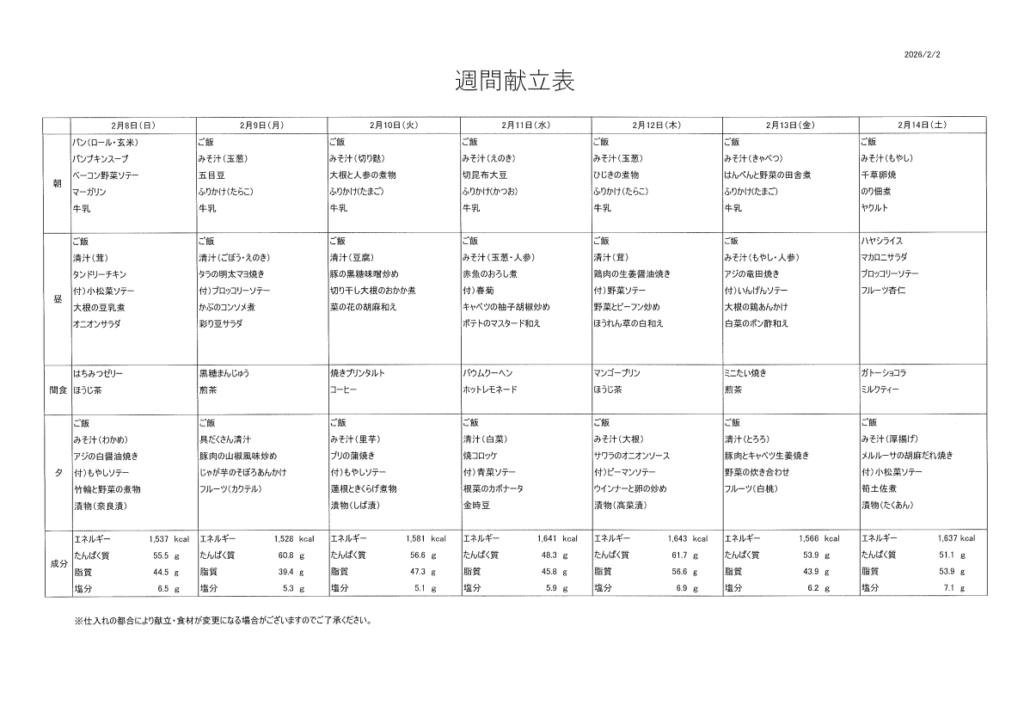 献立表(2/8~2/14) silstaff0928 2026年2月1日 2026年2月1日 お知らせ / その他(デイサービス) / その他(有料老人ホーム) 前の投稿1月行事食(デイサービス) 次の投稿