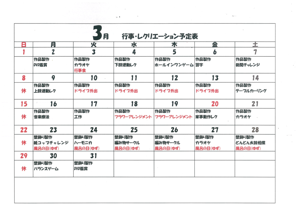 令和8年3月行事・レクリエーション予定表(デイサービス) silstaff0928 2026年2月28日 2026年2月28日 お知らせ / その他(デイサービス) 前の投稿献立表(3/1~3/7) 次の投稿2月行事「節分」(デイサービス)
