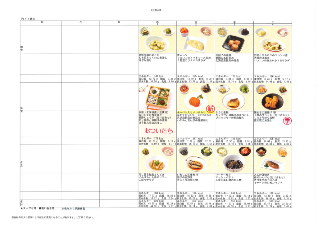 献立表(3/29~4/4) silstaff0928 2026年3月23日 2026年3月23日 お知らせ / その他(デイサービス) / その他(有料老人ホーム) / デイサービス / ホーム 前の投稿献立表(3/22~3/28) 次の投稿